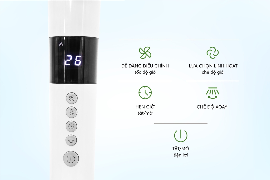 Các nút điều khiển được sắp xếp thuận tiện ngay trên thân quạt, màn hình LED hiển thị cấp độ gió cho người dùng dễ dàng theo dõi và thao tác.